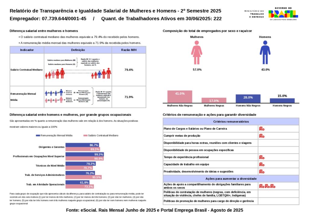 Sendo assim, ao tornar públicos os números de remuneração, demonstramos o compromisso em construir relações mais justas, éticas e responsáveis. Dessa forma, reforçamos que igualdade de oportunidades e valorização da diversidade são pilares da nossa gestão de pessoas.